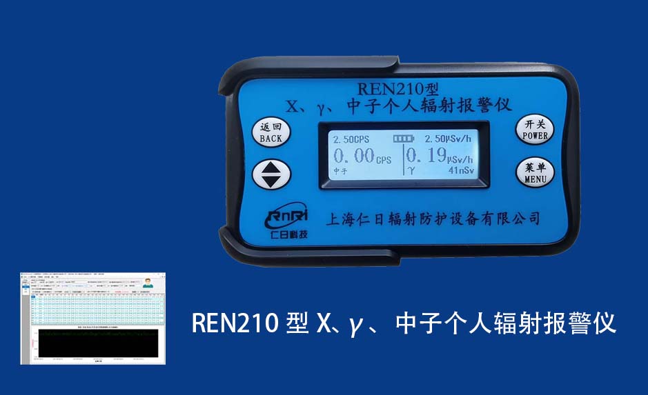 REN210型X、γ、中子個人輻射報警儀內置SiPM和鋰玻璃晶體組成中子探測器儀器,采用反照率方式探測中子射線,同時也能探測X、γ射線。因此它可同事監檢測X、γ、中子三種射線。能顯示工作場所的劑量當量率和累積劑量,更換電池時,日期及累積數據能永久保存。可選配RenRiPersonal個人劑量管理軟件,該軟件可存儲多個人的歷史數據,能記錄日累積、月累積、年累積、輻照時長、計算平均劑量率、扣除或不扣除本底輻射,且以文字和圖譜的方式展現數據。廣泛應用于環保、化工、水泥、煤礦、土木工程、石油、醫院、疾控、進出口商檢、核電、加速器、機場、中子源庫和其他安檢、邊境控制海關檢測等